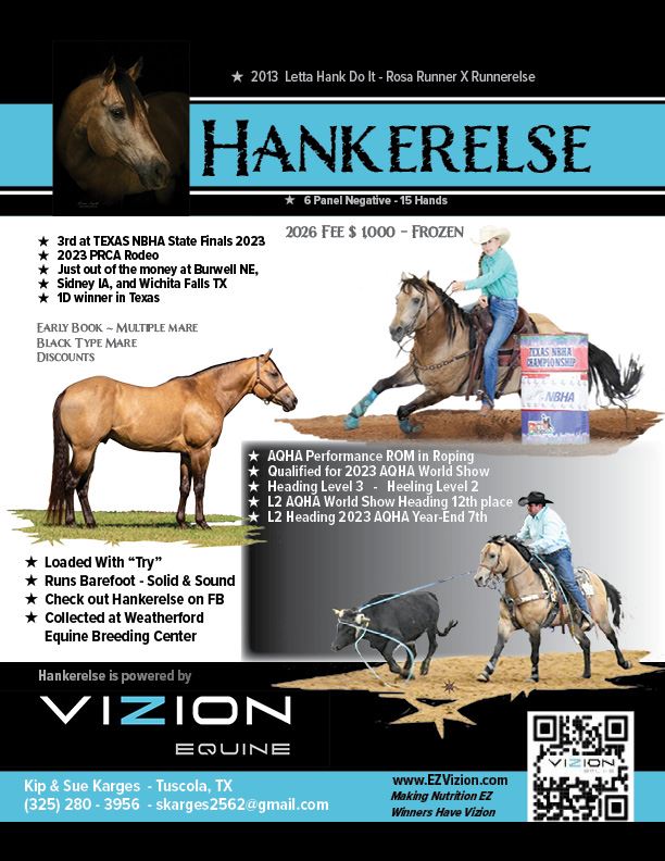 It is a trend now to cross cow-bred on run in our industry, to improve soundness, mind and desire to turn. Please consider the old school barrel pedigree of Hankerelse combined with his proven performance in barrels, roping, and now pole bending for your next outcross on your speed mares.