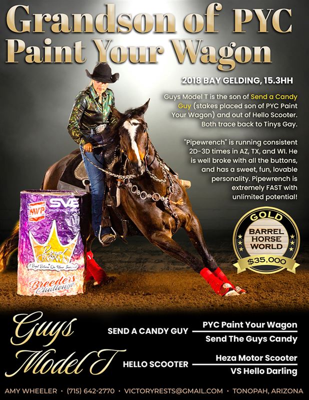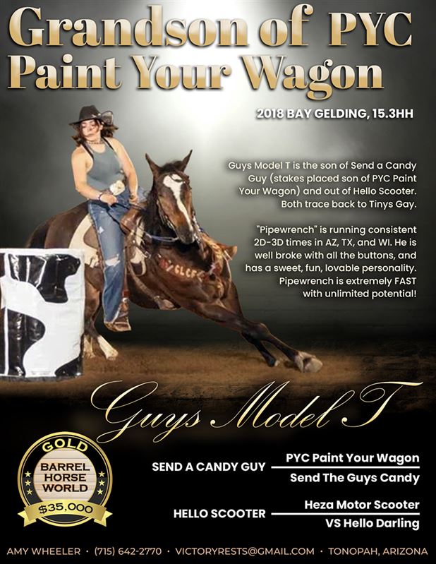 Guys Model T is a 2018 son of Send a Candy Guy (stakes placed son of PYC Paint Your Wagon) and out Hello Scooter. Both trace back to Tinys Gay.Pipewrench is running consistent 2D-3D times in Az , TX and WI. Pipewrench is a beautiful 15.3 hand bay. Well broke with all the buttons. Sweet, fun, lovable personality. Pipewrench is extremely FAST with unlimited potential!! 35K. Call or text 715-642-2770